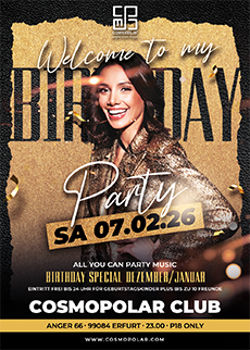 Geburtstag ist nur einmal im Jahr und das feiert man doch nicht im kleinen Kreis in den eigenen 4 Wänden! Wir laden Euch heute zu eurer persönlichen Geburtstagsparty ein, zu der ihr nicht nur kostenlosen Eintritt erhaltet, ihr könnt Eure Gang gleich mit einladen, denn bis zu 10 Freunde zahlen ebenfalls keinen Eintritt!* Habt ihr im DEZEMBER/JANUAR (oder heute) Geburtstag, dann stellen wir Euch heute gerne unser Partywohnzimmer mitten in Eurer Lieblings-Hauptstadt zur verfügung! Wer es richtig krachen lassen will, kann sich heute zu Sonderkonditionen VODKA RED BULL für nur 5€ oder die eine oder andere Flasche SCAVI & RAY Prosecco für nur 15€ gönnen. Das Ziel ist klar: diese Geburtstagsparty wollen wir so schnell nicht mehr vergessen 🙂 FREE ENTRY SPECIAL: DRINK SPECIALS: MUSIC: TISCHRESERVIERUNGEN per Mail an reservierung@cosmopolar.com date: Samstag, 07.02.26 |