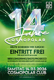 DIESES JAHR GEBEN WIR ZURÜCK !!! Wir feiern Geburtstag – und Ihr seid eingeladen! Wahnsinn, wie die Zeit vergeht: Ganze 14 Jahre Cosmopolar! Vor über einem Jahrzehnt haben wir im Rahmen einer legendären Radio Top40-Sause erstmals die Türen für euch geöffnet. Seitdem haben wir gemeinsam unzählige unvergessliche Nächte erlebt, gelacht, getanzt und gefeiert. Dieses Jahr drehen wir noch einmal richtig auf! Am Samstag feiern wir unsere BIG BIRTHDAY CELEBRATION und laden euch ein, eine Nacht mit uns Vollgas zu geben! Wir verzichten dieses Jahr auf ein großes DJ Line Up, haben dafür aber folgende Specials für euch: 23:00 – 24:00 Uhr Eintritt frei für alle Gäste All-Night-Long: Crema Di Limoncello Shot 1€ Kommt vorbei und lasst uns gemeinsam die Nacht zum Tag machen – wir freuen uns auf euch! 🎉 TISCHRESERVIERUNGEN per Mail an reservierung@cosmopolar.com date: saturday 14.03.2026 |