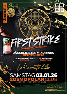 FIRST STRIKE – JÄGERMEISTER CLUBNIGHT – WELCOME TO 2026! Neues Jahr, gleicher Pegel – und wir verschwenden keine Zeit! Mit FIRST STRIKE setzen wir direkt am ersten Samstag 2026 das Ausrufezeichen und eröffnen das neue Partyjahr so, wie es sich gehört: laut, wild und kompromisslos. Wenn die Lichter angehen und der Bass einsetzt, füllen sich die Gläser – heute natürlich gern mit dem legendären Kräuterlikör aus Wolfenbüttel. JÄGERMEISTER steht im Mittelpunkt dieser Nacht und liefert euch die perfekte Grundlage für eine eskalative Clubnight in der House vs Black Edition. 🍾 JÄGERMEISTER SPECIALS + Jägermeister Mixdrinks nur 5€ Dazu warten Giveaways auf euch – solange der Vorrat reicht! Musikalisch bleibt alles beim bewährten Cosmo-Rezept: fette Black-, House- & Club-Classics, die den Dancefloor vom ersten Drop an zum Kochen bringen. Kein Warm-up, kein Zurückhalten – FIRST STRIKE ist der erste Treffer des Jahres und der sitzt. Also: Crew sammeln, Vorsätze kurz vergessen und mit uns ins Jahr 2026 starten – gleiche Nächte, gleiche Eskalation, neues Kapitel. TISCHRESERVIERUNGEN per Mail an reservierung@cosmopolar.com date: Sanstag, 03.01.2026 |