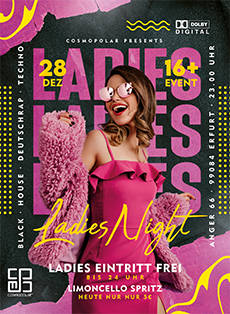 Die Weihnachtsferien sind schon wieder fast durch, was bleibt uns da anderes übrig als zur nächsten P16-Party im Herzen Erfurts zu laden um mit Euch die Nacht wieder ordentlich zum Tag zu machen? Aufgepasst: Wir schenken den LADIES heute bis 24 Uhr den Eintritt! Eingeladen sind heute natürlich nicht nur Schüler, sondern auch alle anderen, denen die Erfurter Nächte in der Woche zu langweilig sind! Musikalisch bleibt alles beim gewohnten Party-Rezept: feinste Black / HipHop / Deutschrap und Trap Beats kombinieren wir für Euch mit House / Techno und EDM Vibes. Dazu kommt LIMONCELLO SPRITZ für nur 5€! Entry-Special: + EINTRITT FREI für LADIES bis 24 Uhr Drink-Special: + LIMONCELLO SPRITZ 5€ Du willst Freetix ? Kein Problem ! Noch nicht 18? Ab 16 Jahren könnt ihr mit einem ausgefüllten Partyzettel an unserem Event teilnehmen: http://www.partyzettel.de/partyzettel.pdf ACHTUNG – WICHTIG: Partyzettel bitte in doppelter ausgefüllter Ausführung mitbringen! (Für das Verlassen der Veranstaltung zur von den Eltern festgelegten Zeit, ist die Aufsichtsperson verantwortlich!) #ICHBINNACHTSWACH date: Sonntag, 28.12.2025 |